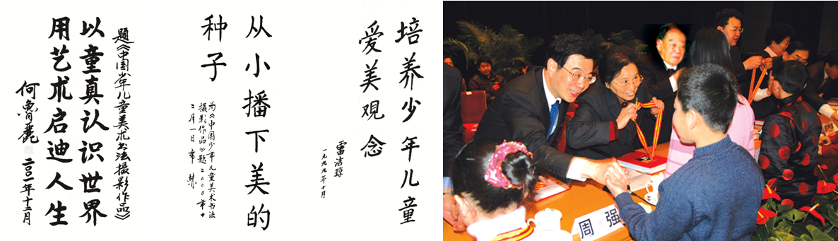 该活动一直得到原全国人大常委会副委员长何鲁丽、布赫、雷洁琼等国家领导的亲切关怀,他们分别为《中国少年儿童美术书法摄影作品》题词。何鲁丽、布赫多次出席《中国少年儿童美术书法摄影作品》首发式并与小作者们合影留念。历届首发式上先后有国家领导人、团中央第一书记周强、历任团中央书记处书记黄丹华、杨岳、尔肯江·吐拉洪、卢雍政、汪鸿雁等也曾出席首发式并讲话。出席会议的还有全国关心下一代工作委员会、全国少少先队工作委员会、全国妇联、中国青少年研究会、中国青少年研究中心、中国科协等国家相关部门领导,并为小作者